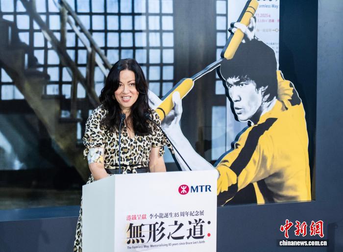 图为特为前去的李小龙基金会开办人兼会少、李小龙之女李喷鼻凝(Shannon Lee)正在铺览掀幕典礼上致辞。记者 侯宇 摄