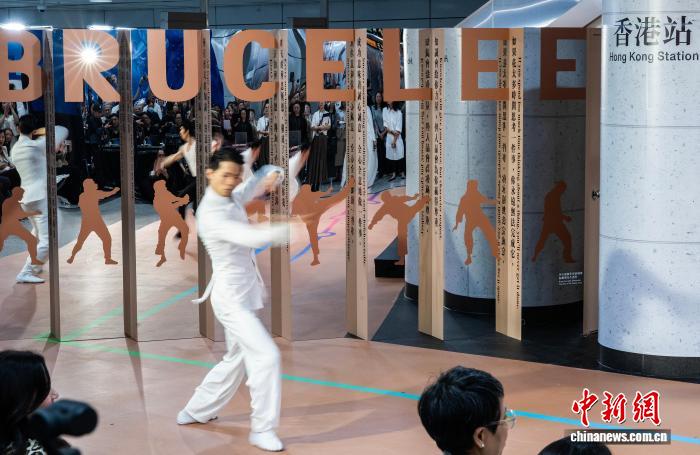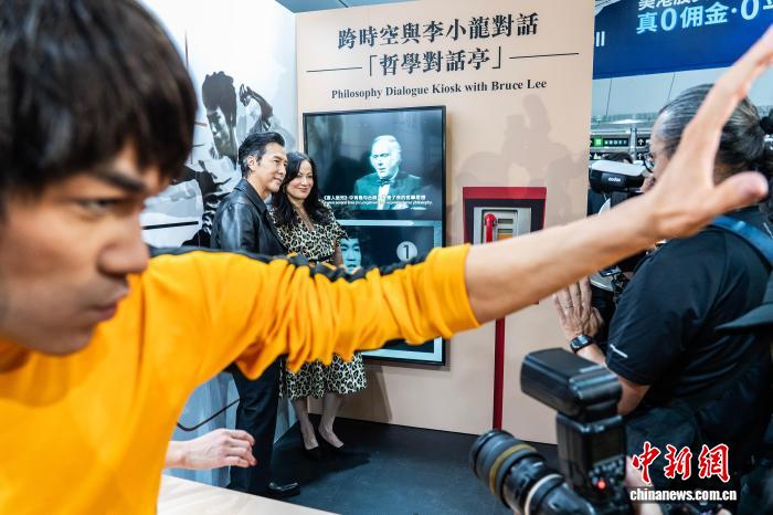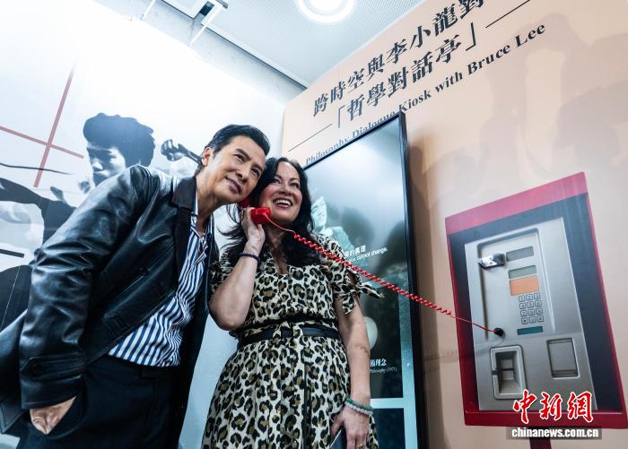图为李小龙基金会开办人兼会少、李小龙之女李喷鼻凝(Shannon Lee,左)战行动影望亮星甄子丹正在港铁喷鼻港站内乱的“德律风亭”互动铺区倾听李小龙的声响。记者 侯宇 摄