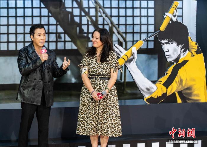图为李小龙基金会开办人兼会少、李小龙之女李喷鼻凝(Shannon Lee,左)战行动影瞅亮星甄子丹正在掀幕典礼上归问发问。记者 侯宇 摄
