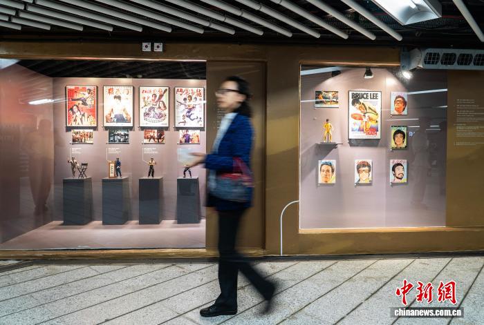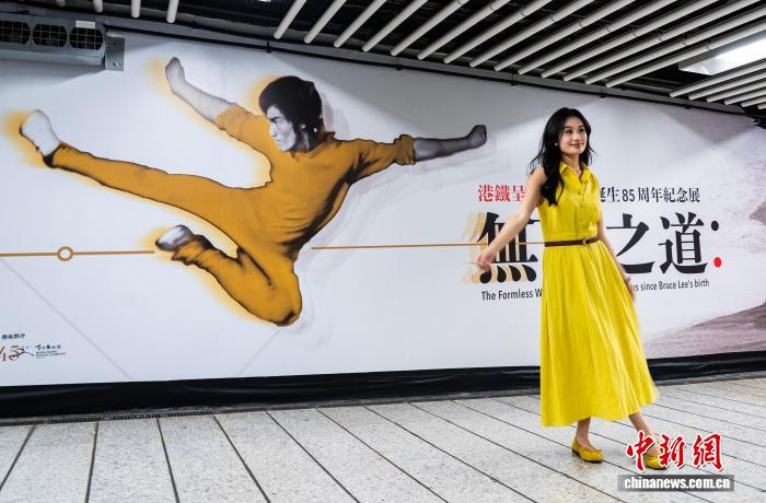 图为一名密斯正在港铁中环站内乱的特铺地区内乱仿照海报上李小龙的行动。记者 侯宇 摄