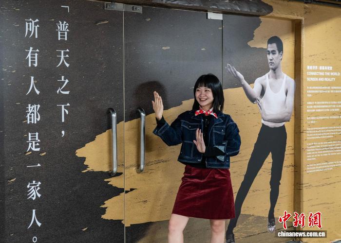 图为一名密斯正在李小龙的巨幅海报前摄影纪念。记者 侯宇 摄